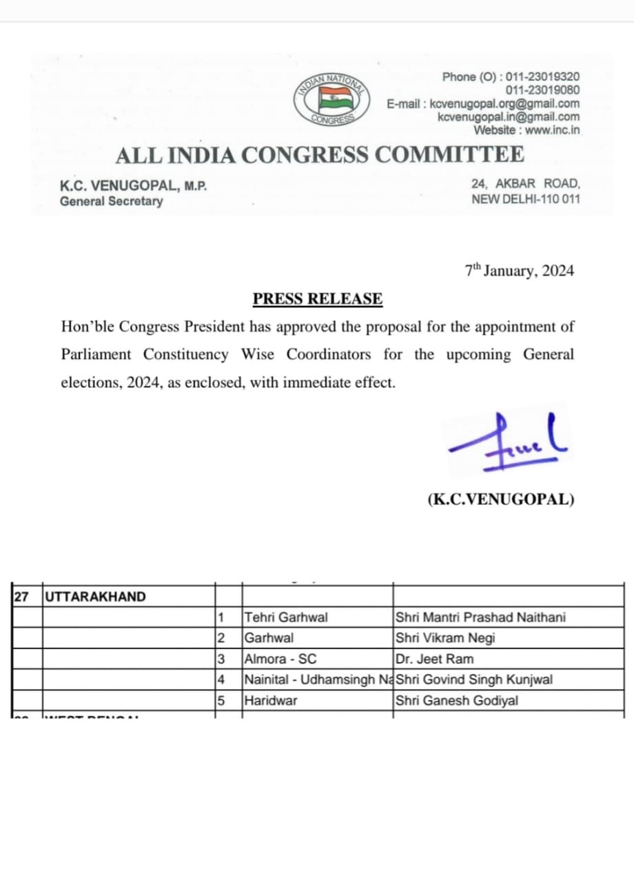 देहरादून से संवाददाता मुकेश कुमार : आगमी लोकसभा चुनाव को लेकर कांग्रेस ने प्रदेश के वरिष्ठ नेताओं को दी बड़ी जिम्मेदारी। कांग्रेस ने प्रदेश की पांच लोकसभा सीटों पर प्रभारी किये नियुक्त। नैनीताल उधम सिंह नगर जिले की लोकसभा सीट पर कांग्रेस ने गोविंद सिंह कुंजवाल को प्रभारी किया नियूक्त। मंत्री प्रसाद नैथानी को टिहरी “तो गढ़वाल से विक्रम नेगी को दी जिम्मेदारी”वही जीत राम को सौपी अल्मोड़ा की जिम्मेदारी”गणेश गोदियाल को बनाया हरिद्वार का प्रभारी।