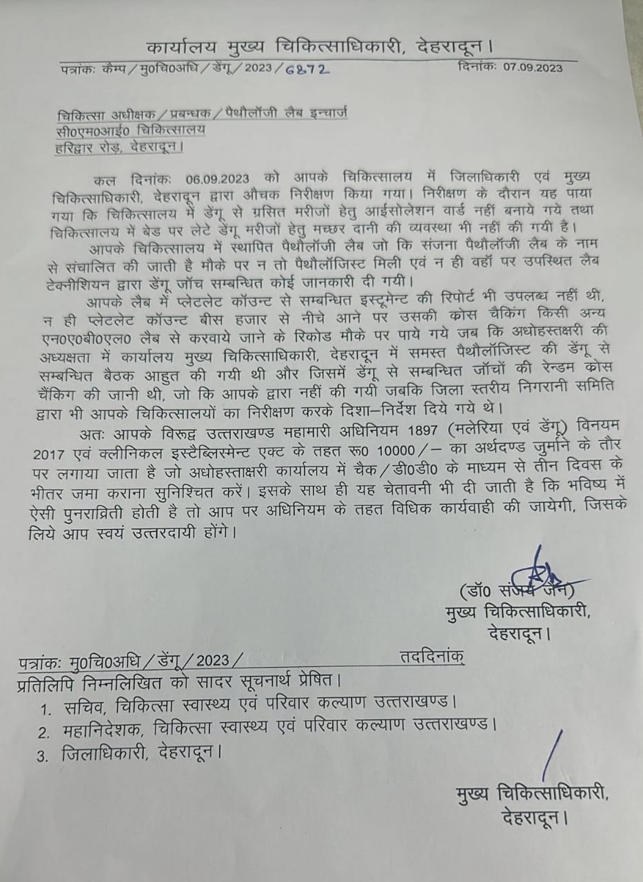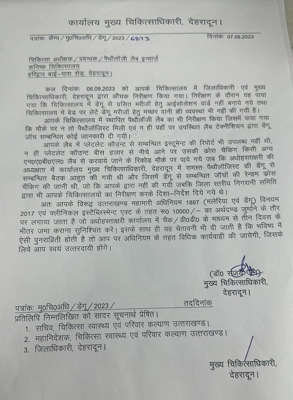 जबकि मुख्य चिकित्सा अधिकारी की अध्यक्षता में कार्यालय मुख्य चिकित्साधिकारी, देहरादून में समस्त पैथालॉजिस्ट की डेंगू से सम्बन्धित बैठक आहुत की गयी थी और जिसमें डेंगू से सम्बन्धित जाँचों की रेन्डम क्रॉस चैंकिग की जानी थी, जो कि नहीं की गयी जबकि जिला स्तरीय निगरानी समिति द्वारा भी चिकित्सालयों का निरीक्षण कर दिशा-निर्देश दिये गये थे।