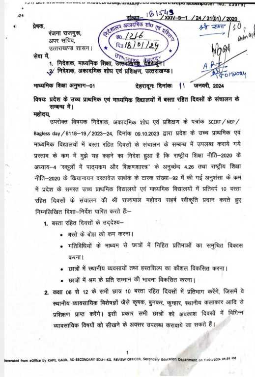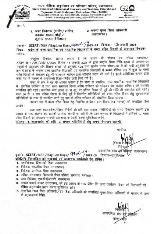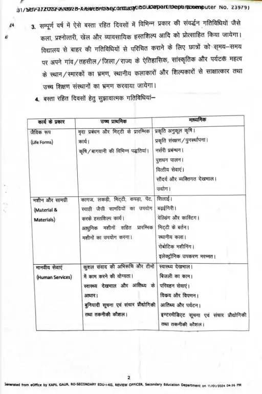 उपर्युक्त विषयक, अवगत कराना है कि शासन के संलग्न पत्र संख्या 181549/ XXIV-B-1/24/31(01)/2020 दिनांक 11 जनवरी 2024 के द्वारा राष्ट्रीय शिक्षा नीति-2020 के अध्याय-04 ‘स्कूलों में पाठ्यक्रम और शिक्षण शास्त्र” के अनुच्छेद 4.26 तथा सार्थक टास्क संख्या-92 में की गयी अनुशंसा के क्रम में प्रदेश के समस्त उच्च प्राथमिक विद्यालयों एवं माध्यमिक विद्यालयों में प्रत्येक शैक्षिक सत्र में कुल 10 बस्ता रहित दिवसों के संचालन हेतु राज्यपाल महोदय द्वारा स्वीकृति प्रदान की गयी है। इसके अतिरिक्त शासन द्वारा उक्त पत्र के माध्यम से तत्सम्बन्धी दिशा-निर्देश जारी किये गये हैं।