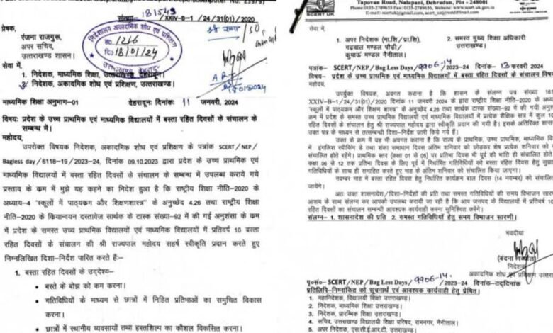 देहरादून : उत्तराखंड शिक्षा विभाग से बड़ी खबर सामने आ रही है जहां उत्तराखंड शिक्षा विभाग में ये आदेशजारी किए गए हैं। प्रदेश के उच्च प्राथमिक एवं माध्यमिक विद्यालयों में बस्ता रहित दिवसों के संचालन विषयक ।