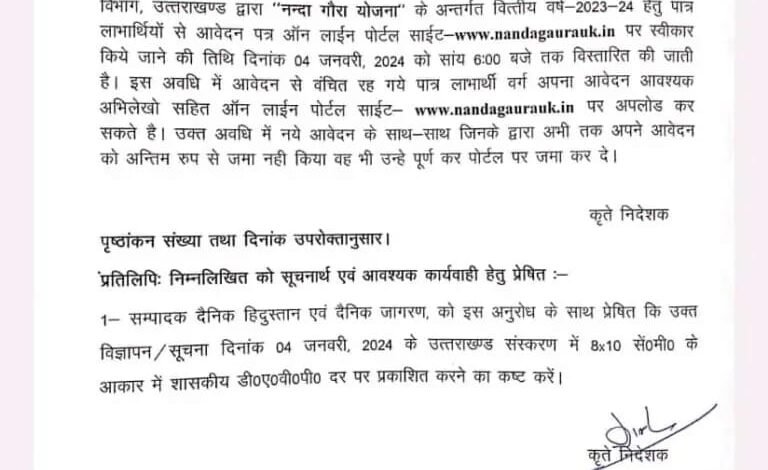 सर्वसाधरण को सूचित किया जाता है कि महिला सशाक्तिकरण एवं बाल विकास विभाग, उत्तराखण्ड द्वारा “नन्दा गौरा योजना” के अन्तर्गत वित्तीय वर्ष-2023-24 हेतु पात्र लाभार्थियों से आवेदन पत्र ऑन लाईन पोर्टल साईट www.nandagaurauk.in पर स्वीकार किये जाने की तिथि दिनांक 04 जनवरी, 2024 को सांय 6:00 बजे तक विस्तारित की जाती है। इस अवधि में आवेदन से वंचित रह गये पात्र लाभार्थी वर्ग अपना आवेदन आवश्यक अभिलेखो सहित ऑन लाईन पोर्टल साईट www.nandagaurauk.in पर अपलोड कर सकते है। उक्त अवधि में नये आवेदन के साथ-साथ जिनके द्वारा अभी तक अपने आवेदन को अन्तिम रुप से जमा नही किया