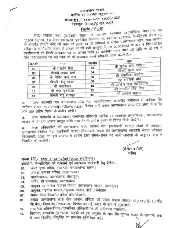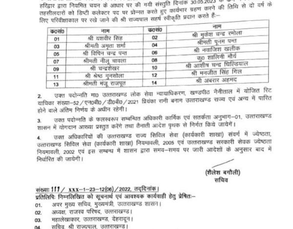 उत्तराखण्ड में 14 नए एसडीएम मिल गये हैं। लोक सेवा आयोग ने 14 तहसीलदारों को एसडीएम के पद पर डीपीसीसी करने के बाद सचिव कार्मिक शैलेश बगौली ने इन सभी अधिकारियों के आदेश जारी कर दिए हैं। उन्होंने आदेश म लिखा है कि राज्य सिविल सेवा (कार्यकारी शाखा) के साधारण वेतनमान (अपुनरीक्षित वेतनमान रू० 15.600-39.100, ग्रेड वेतन रू0 5400, पुनरीक्षित वेतनमान रू0 56.100-1.77.500, पे-मैट्रिक्स लेवल 10) के अन्तर्गत प्रोन्नति कोटे की चयन वर्ष 2022-23 की रिक्तियों के सापेक्ष उत्तराखण्ड लोक सेवा आयोग, हरिद्वार द्वारा नियमित चयन के आधार पर की गयी संस्तुति दिनांक 30.05.2023 के क्रम में निम्नलिखित तहसीलदारों को डिप्टी कलेक्टर पद पर प्रोन्नत करते हुए कार्यभार ग्रहण करने की तिथि से दो वर्ष के लिए परिवीक्षाकाल पर रखे जाने की श्री राज्यपाल सहर्ष स्वीकृति प्रदान करते हैं। प्रोन्नत डिप्टी कलेक्टर्स में निम्न नाम शामिल हैं।