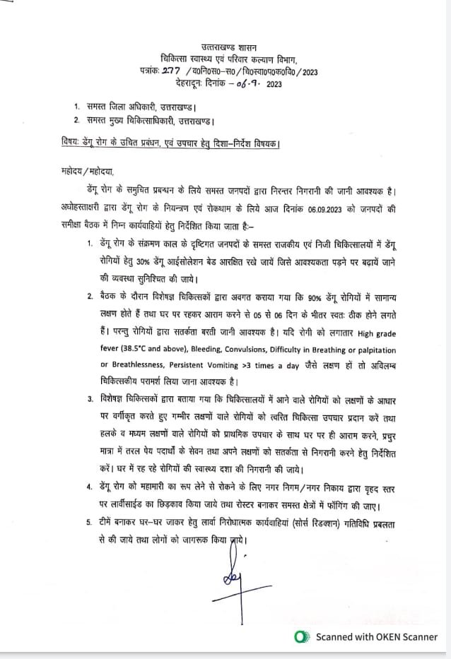 Dehradun : सीएम धामी के निर्देश पर स्वास्थ्य विभाग ने डेंगू रोगियों के उपचार व उचित देखभाल के लिए गाइडलाइन की जारी