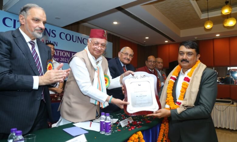 देहरादून : 1 नवंबर 2023 को DOON CITIZENS COUNCIL द्वारा होटल मधुबन राजपुर रोड में सम्मान समारोह का आयोजन किया गया जिसमें मुख्य अतिथि महामहिम राज्यपाल केरल आरिफ मोहम्मद खान द्वारा वरिष्ठ पुलिस अधीक्षक देहरादून अजय सिंह को “PRIDE OF DOON AWARD” से नवाजा गया।