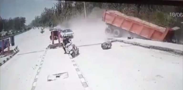 लच्छीवाला टोल कर्मी राकेश नौटियाल ने बताया दोपहर के समय देहरादून की ओर से आ रही युवती टोल प्लाजा के पास पहुंची तो पीछे से एक तेज गति से आते हुए खनन से भरे ट्रक ड्राइवर ने अपना संतुलन खो दिया. यह ट्रक युवती के ऊपर चढ़ने के बजाय दूसरी साइड पर जाकर पलट गया. बताया जा रहा है कि अचानक ट्रक के ब्रेक फेल हो गए. यह ट्रक तेज गति से टोल प्लाजा के लेन नंबर 10 में घुस गया. ट्रक ड्राइवर की सूझबूझ से एक बड़ा हादसा होने से टल गया