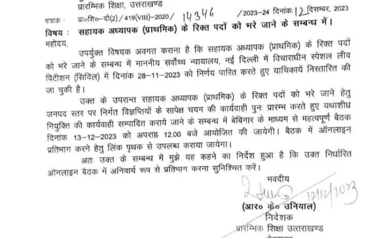 उक्त के उपरान्त सहायक अध्यापक (प्राथमिक) के रिक्त पदों को भरे जाने हेतु जनपद स्तर पर निर्गत विज्ञप्तियों के सापेक्ष चयन की कार्यवाही पुनः प्रारम्भ करते हुए यथाशीघ्र नियुक्ति की कार्यवाही सम्पादित कराये जाने के सम्बन्ध में बेबिनार के माध्यम से महत्वपूर्ण बैठक दिनांक 13-12-2023 को अपराह्न 12.00 बजे आयोजित की जायेगी। बैठक में ऑनलाइन प्रतिभाग करने हेतु लिंक पृथक से उपलब्ध कराया जायेगा।