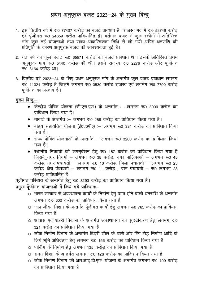 जोशीमठ आपदा प्रभावित क्षेत्र के प्रबन्धन हेतु मूल बजट में रू0 1000 करोड़ का प्राविधान किया गया था इसके अतिरिक्त अनुपूरक बजट के माध्यम से रू० 100 करोड़ का अतिरिक्त प्राविधान किया जा रहा है।