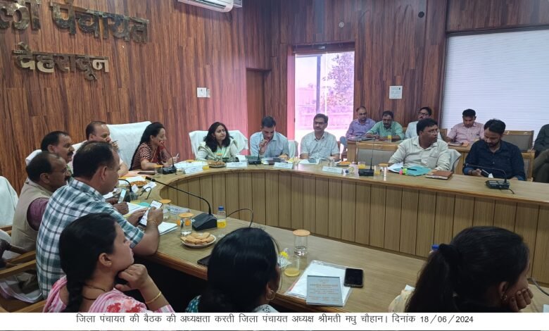 देहरादून। जिला पंचायत अध्यक्ष मधु चौहान की अध्यक्षता में जिला पंचायत सभागार में जिला पंचायत की बैठक आयोजित की गई। बैठक में गत बैठक में दिये गए निर्देशों एवं लिए गए निणर्यों की कार्यवाही की समीक्षा, जिला योजना वर्ष 2024-25 के लिए जनपद के ग्रामीण क्षेत्रों की विकास योजना के अनुमोदन, विकासखण्डो से मनरेगा के अन्तर्गत प्राप्त प्रस्तावों के अनुमोदन पर विचार आदि बिन्दुओं पर विस्तार पूर्वक चर्चा हुई।