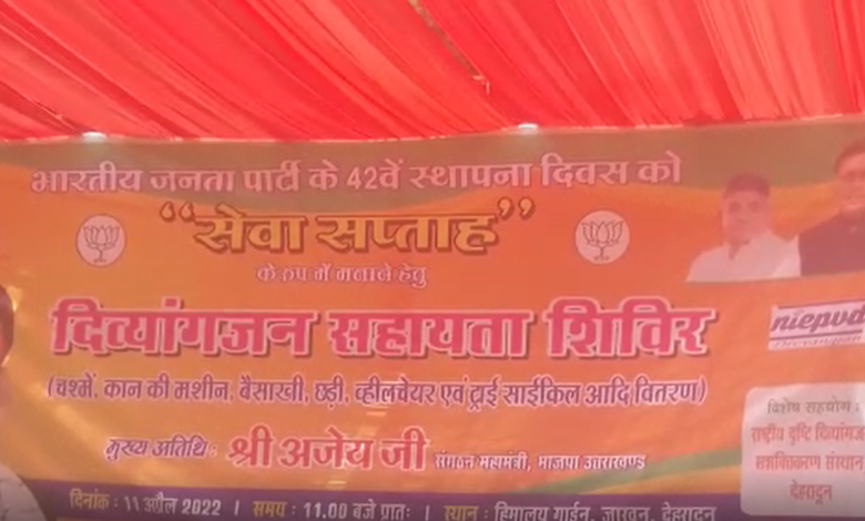 जिसमें कैबिनेट मंत्री गणेश जोशी मुख्य अतिथि के रूप में संगठन महामंत्री अजय जी ने शिरकत की। कार्यकर्म में जरूरत दिवयांग लोगो को वीलचैयर चश्मा साइकल बैसाखी का वितरण किया गया कार्यकर्म में गणेश जोशी ने बताया की देश भर में भाजपा स्थापना दिवस सेवा के रूप में माना रही है इस कार्य में पार्टी दिव्यांग जरूरत मंद लोगो सहायता देने का कार्य कर रही है।