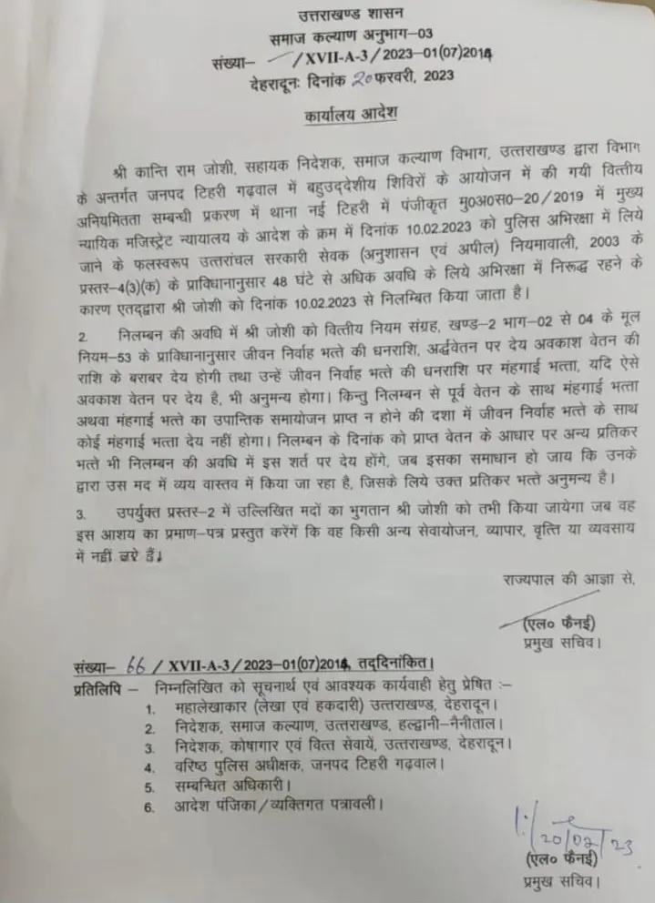 आज शासन ने समाज कल्याण मंत्री चंदन राम दास के हस्ताक्षर के बाद निलंबन आदेश जारी कर दिए, समाज कल्याण मंत्री चंदन रामदास ने कहा कि भ्रष्टाचारियों के खिलाफ सरकार की जीरो टॉलरेंस की नीति है किसी भी भ्रष्टाचारी को बख्शा नहीं जाएगाl वही प्रमुख सचिव समाज कल्याण एल. फैन्नई ने बताया कि कांति राम जोशी के अन्य मामलों को भी दिखाया जा रहा है और अन्य मामलों में भी जल्दी ही कार्यवाही की जाएगीl