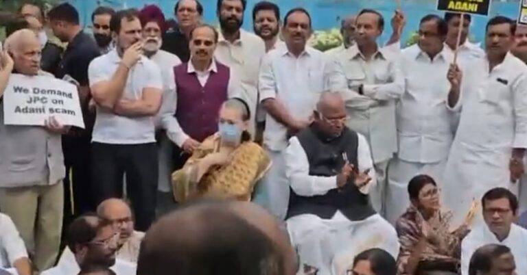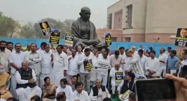 कांग्रेसी सांसद राहुल गांधी को बोलने दो के नारे लगा रहे थे। जबकि जबकि भाजपा पिछले 4 दिन से राहुल गांधी के कैम्ब्रिज वाले बयान पर माफी की मांग कर रही है। राज्यसभा भी सोमवार तक के लिए स्थगित कर दी गई है। विपक्षी दलों ने सोनिया गांधी, राहुल और कांग्रेस अध्यक्ष मल्लिकार्जुन खड़गे के साथ मिलकर महात्मा गांधी की मूर्ति के पास अडानी मामले पर विरोध प्रदर्शन किया।
