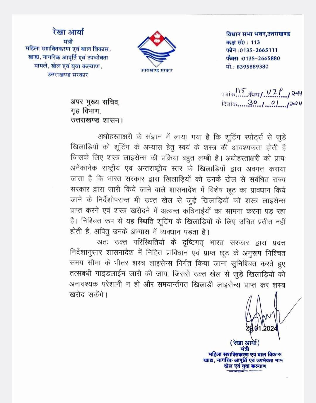 खेल मंत्री रेखा आर्या ने गृह सचिव और पुलिस महानिदेशक को लिखा पत्र,कहा जल्द ही शूटिंग खिलाड़ियो को दिए जाने वाले शस्त्र लाइसेन्स की निश्चित समय सीमा के भीतर शस्त्र लाइसेंस की करे गाइडलाईन जारी