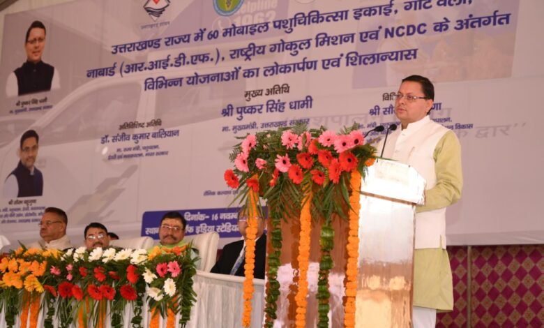 मुख्यमंत्री पुष्कर सिंह धामी ने सर्वे स्टेडियम, हाथीबड़कला देहरादून में पशु पालन विभाग द्वारा आयोजित कार्यक्रम में प्रतिभाग कर राज्य में 60 मोबाइल पशु चिकित्सालय इकाइयों का लोकार्पण किया। इस अवसर पर उन्होंने गोट वैली योजना का शुभारंभ किया एवं नाबार्ड द्वारा वित्त पोषित रूरल इंफ्रास्ट्रक्चर डेवलेपमेन्ट फण्ड योजना के अन्तर्गत पशुलोक ऋषिकेश, में हीफर रियरिंग फार्म का लोकार्पण भी किया।