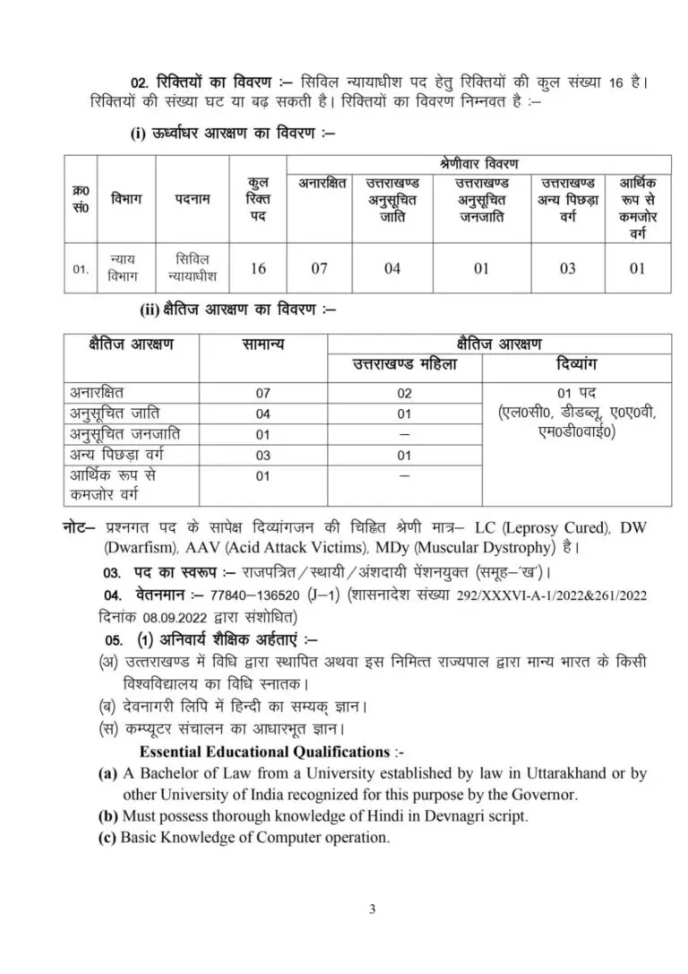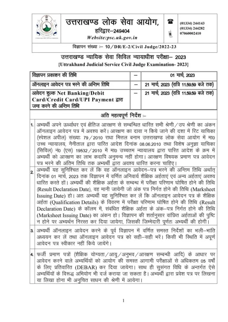 UKPSC News:उत्तराखण्ड लोक सेवा आयोग द्वारा उत्तराखण्ड न्यायिक सेवा सिविल न्यायाधीश परीक्षा -2023 के रिक्त 16 पदों पर सीधी भर्ती के माध्यम से चयन हेतु ऑनलाइन आवेदन – पत्र ( Online Application ) आमन्त्रित किये जाते हैं। पात्र अभ्यर्थी आयोग की वेबसाइट पर दिनांक 21 मार्च , 2023 तक ऑनलाइन आवेदन कर सकते है।