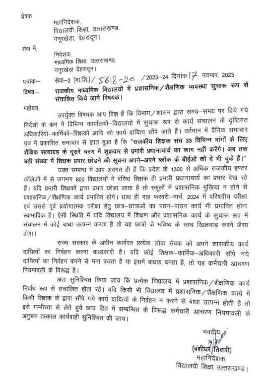 यहां DG शिक्षा हुए सख्त, दिए कार्यवाई के निर्देश Dehradun : राजकीय माध्यमिक विद्यालयों में प्रशासनिक / शैक्षणिक व्यवस्था सुचारू रूप से संचालित किये जाने विषयक |उपर्युक्त विषयक आप विज्ञ हैं कि विभाग / शासन द्वारा समय-समय पर दिये गये निर्देशों के क्रम में विभिन्न कार्यालयों विद्यालयों में सुचारू रूप से कार्य संचालन के दृष्टिगत अधिकारियों-कार्मिकों शिक्षकों आदि को कार्य दायित्व सौंपे जाते हैं। वर्तमान में दैनिक समाचार पत्र में प्रकाशित समाचार से ज्ञात हुआ हैं कि “राजकीय शिक्षक संघ 33 विभिन्न मांगों के लिए शैक्षिक सत्याग्रह के दूसरे चरण में शुक्रवार से प्रभारी प्रधानाचार्य का काम नहीं करेंगे। अब तक बड़ी संख्या में शिक्षक प्रभार छोड़ने की सूचना अपने-अपने ब्लॉक के बीईओ को दे भी चुके हैं।” उक्त सम्बन्ध में आप अवगत ही हैं कि प्रदेश के 1300 से अधिक राजकीय इण्टर कॉलेजों में से लगभग 800 विद्यालयों में वरिष्ठ शिक्षक ही प्रभारी प्रधानाचार्य का प्रभार देख रहे हैं। यदि प्रभारी शिक्षकों द्वारा प्रभार छोड़ा जाता है तो स्कूलों में प्रशासनिक मुखिया न होने से प्रशासनिक / शैक्षणिक कार्य प्रभावित होंगे। साथ ही माह फरवरी-मार्च, 2024 में परिषदीय परीक्षा एवं उससे पूर्व प्रयोगात्मक परीक्षा हेतु छात्र-छात्राओं का पठन-पाठन कार्य भी प्रभावित होना स्वाभाविक है। ऐसी स्थिति में यदि विद्यालय में शिक्षण और प्रशासनिक कार्य के सुचारू रूप में संचालन में कोई बाधा उत्पन्न करता है तो यह छात्रों के भविष्य के साथ खिलवाड़ करने जैसा होगा । राज्य सरकार के अधीन कार्यरत प्रत्येक लोक सेवक को अपने शासकीय कार्य दायित्वों का निर्वहन करना बाध्यकारी है। यदि कोई शिक्षक कार्मिक अधिकारी सौंपे गये दायित्वों का निर्वहन करने से मना करता है या इसमें बाधक बनता है, तो यह कर्मचारी आचरण नियमावली के विरूद्ध है। अतः सुनिश्चित किया जाय कि प्रत्येक विद्यालय में प्रशासनिक / शैक्षणिक कार्य निर्वाध रूप से संचालित होता रहे। यदि किसी भी विद्यालय में प्रशासनिक / शैक्षणिक कार्य में किसी शिक्षक के द्वारा सौंपे गये कार्य दायित्वों के निर्वहन न करने से बाधा उत्पन्न होती हैं तो इसे गम्भीरता से लेते हुये छात्र हित में सम्बन्धित के विरूद्ध कर्मचारी आचरण नियमावली के अनुरूप तत्काल कार्यवाही सुनिश्चित की जाय।