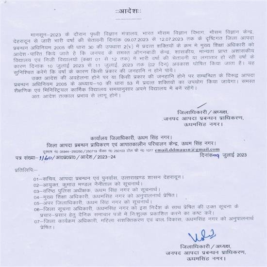 रुद्रपुर– अध्यक्ष जिला आपदा प्रबंधन प्राधिकरण एवम जिलाधिकारी उदयराज सिंह ने मौसम विभाग द्वारा जारी मौसम पूर्वानुमान के दृष्टिगत एवम भारी वर्षा की चेतावनी या लगातार हो रही वर्षा के कारण जिला आपदा प्रबन्धन अधिनियम 2005 की धारा 30 की उपधारा 2 (v) में प्रदत्त शक्तियों के क्रम मे जनपद के समस्त आंगनबाड़ी केन्द्र, शासकीय मान्यता प्राप्त अशासकीय विद्यालय एवं निजी विद्यालयों (कक्षा 01 से 12 तक) राजकीय एवं निजी विद्यालयों में दिनांक 10 व 11 जुलाई 2023 को अवकाश घोषित किया हैं।