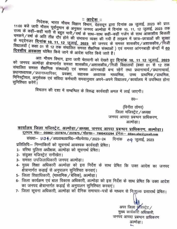 अतः मौसम विभाग द्वारा जारी चेतवानी को देखते हुए दिनांक 10 11 12 जुलाई 2023 को जनपद अल्मोड़ा क्षेत्रान्तर्गत समस्त शासकीय/अशासकीय/निजी विद्यालयों (कक्षा 01 से 12 तक संचालित समस्त शैक्षणिक संस्थाओं) एवं समस्त आंगनबाड़ी बन्द रहेगें तथा प्रधानाचार्य/प्रधानाचार्या, प्रधानाध्यापक/ प्रधानाध्यापिका, प्रवक्ता, सहायक अध्यापक माध्यमिक, उच्च प्राथमिक/प्राथमिक, मिनिस्ट्रीयल, अनुसेवक एवं संविदा कर्मचारी समयानुसार अपने-अपने विद्यालय/कार्यालय में उपस्थित होना सुनिश्चित करेंगें।