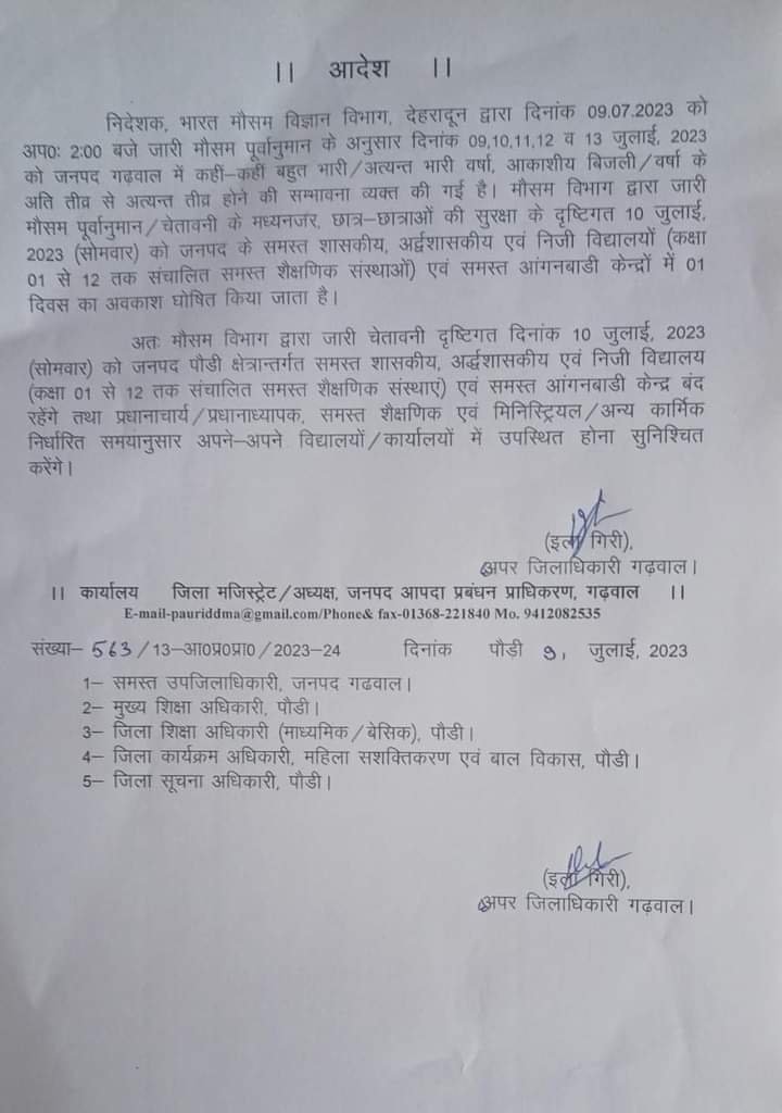 अतः मौसम विभाग द्वारा जारी चेतावनी दृष्टिगत दिनांक 10 जुलाई, 2023 (सोमवार) को जनपद पौड़ी क्षेत्रान्तर्गत समस्त शासकीय, अर्द्धशासकीय एवं निजी विद्यालय (कक्षा 01 से 12 तक संचालित समस्त शैक्षणिक संस्थाएं) एवं समस्त आंगनबाडी केन्द्र बंद रहेंगे तथा प्रधानाचार्य/प्रधानाध्यापक, समस्त शैक्षणिक एवं मिनिस्ट्रियल/अन्य कार्मिक निर्धारित समयानुसार अपने-अपने विद्यालयों/कार्यालयों में उपस्थित होना सुनिश्चित करेंगे।