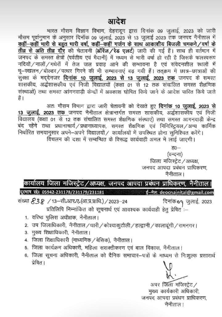 अतः मौसम विभाग द्वारा जारी चेतावनी को देखते हुए दिनांक 10 जुलाई, 2023 से 13 जुलाई, 2023 तक जनपद नैनीताल क्षेत्रान्तर्गत समस्त शासकीय, अर्द्धशासकीय एवं निजी विद्यालय (कक्षा 01 से 12 तक संचालित समस्त शैक्षणिक संस्थाएं) तथा समस्त आगनवाड़ी केन्द्र बंद रहेंगे तथा प्रधानाचार्य/ प्रधानाध्यापक, समस्त शैक्षणिक एवं मिनिस्ट्रियल/अन्य कार्मिक निर्धारित समयानुसार अपने-अपने विद्यालयों/कार्यालयों में उपस्थित होना सुनिश्चित करेंगे। विचलन की दशा में सम्बन्धित के विरूद्ध कार्यवाही अमल में लाई जायेगी।