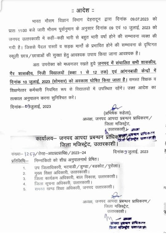 अतः मौसम विज्ञान विभाग द्वारा जारी मौसम चेतावनी के क्रम में दिनांक 10.07.2023 को जनपद पिथौरागढ में कक्षा 01 से कक्षा 12 तक संचालित समस्त शासकीय, अशासकीय विद्यालयों एवं समस्त आंगनवाड़ी केन्द्रों में विद्यार्थियों की सुरक्षा के दृष्टिगत एक दिवसीय अवकाश घोषित किया जाता है। समस्त शिक्षकगण एवं कर्मचारी अपने-अपने विद्यालय/कार्यालय में उपस्थित रहेंगे।