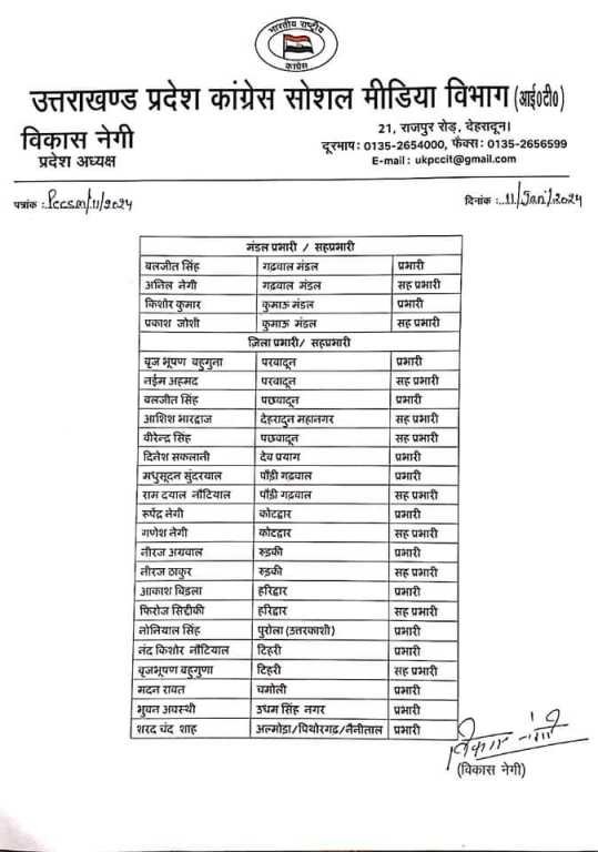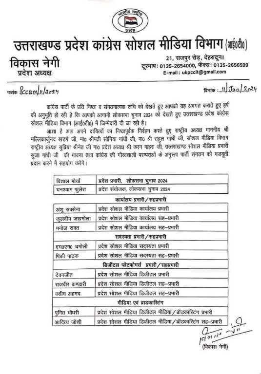 लोकसभा चुनाव को देखते हुए उत्तराखंड कांग्रेस ने प्रदेश कांग्रेस सोशल मीडिया विभाग (आई०टी०) में जिम्मेदारी बांटी, इन्हें मिली जिम्मेदारी