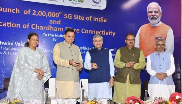 सिंह धामी एवं केंद्रीय संचार एवं रेल मंत्री अश्विनी वैष्णव ने बुधवार को मुख्यमंत्री आवास स्थित मुख्य सेवक सदन में आयोजित कार्यक्रम में उत्तराखण्ड के पवित्र धाम गंगोत्री में संपूर्ण देश के 2 लाख वीं 5जी साइट का शुभारंभ किया। साथ ही संपूर्ण देश की आस्था के केंद्र चारधाम (बद्रीनाथ, केदारनाथ ,गंगोत्री ,यमुनोत्री) में फाइबर कनेक्टिविटी (ऑप्टिकल फाइबर ) के कार्य का शुभारंभ भी किया। जिससे चार धाम को सीधे तौर पर 5- जी नेटवर्क से आच्छादित किया जा सकेगा। मोबाइल,इंटरनेट नेटवर्क की गुणवत्ता में सुधार से चार धाम मंदिर परिसरों के आस पास श्रद्धालुओं को बेहतर कॉल कनेक्टिविटी वीडियो कॉल इंटरनेट कनेक्टिविटी की उपलब्धता हो सकेगी। इस दौरान उनके द्वारा चार धाम फाइबर कनेक्टिविटी एवं 5 जी के विस्तार पर आधारित लघु फिल्म का अवलोकन किया।
