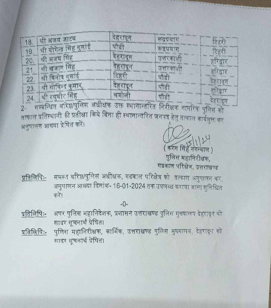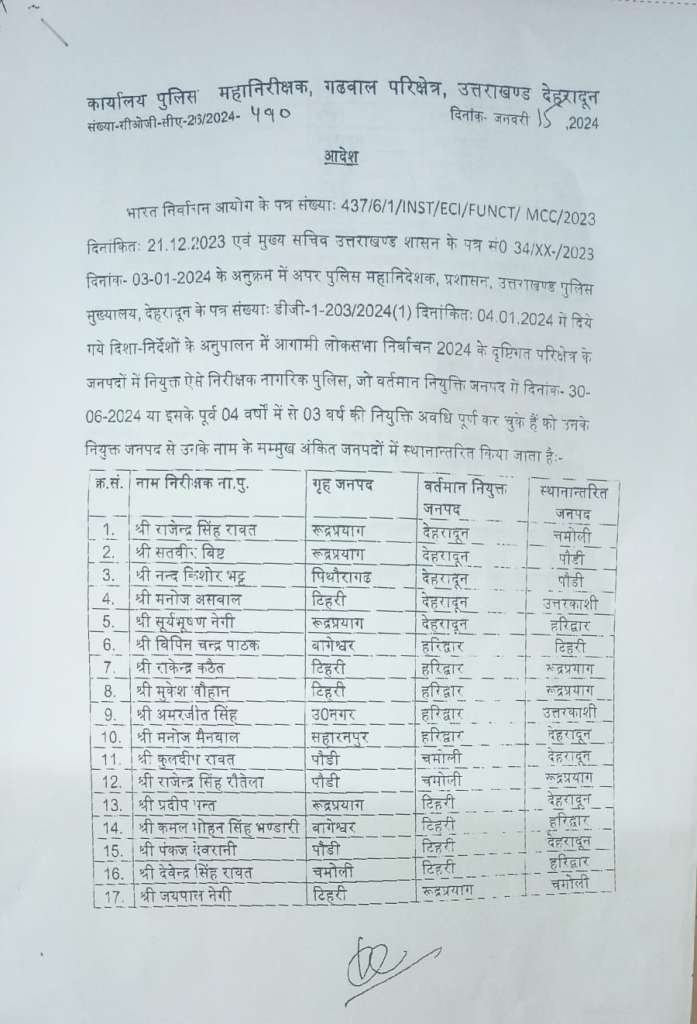 गढ़वाल मंडल में भी निरीक्षकों के हुए तबादले