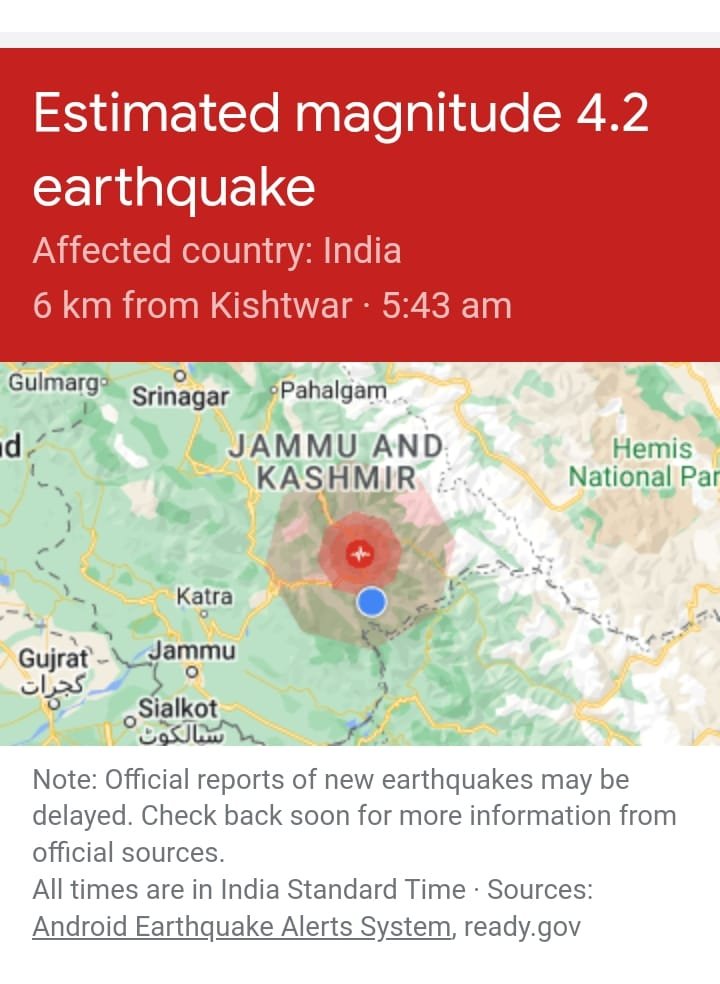भूकंप का केंद्र 33.15 डिग्री अक्षांश और 75.68 डिग्री देशांतर पर गहराई 10 किलोमीटर की गहराई में स्थित था। इस बीच, सुबह 0543 बजे आये दूसरे भूकंप की रिक्टर पैमाने पर तीव्रता 3.6 मापी गई। भूकंप का केंद्र 33.15 डिग्री अक्षांश और 75.7 डिग्री देशांतर पर आठ किलोमीटर की गहराई में स्थित था।