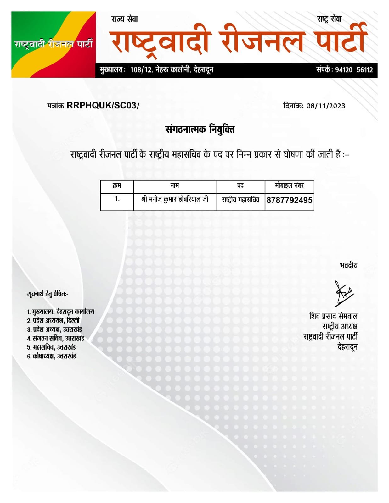 मनोज कुमार डोबरियाल को राष्ट्रवादी रीजनल पार्टी का राष्ट्रीय महासचिव नियुक्त किया गया है।