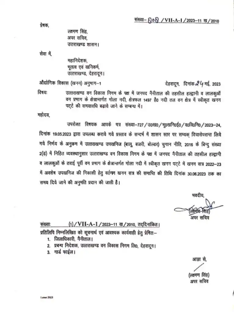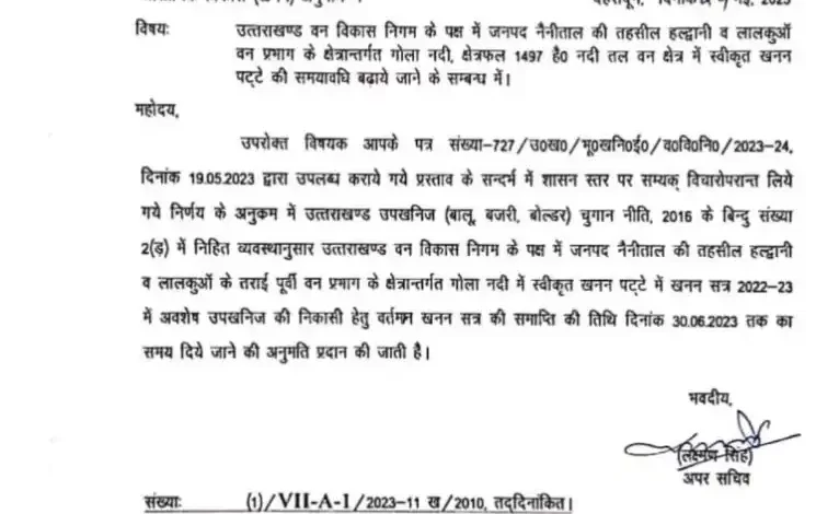 देहरादून। उत्तराखंड शासन से आज की बड़ी खबर सामने आ रही है कि गोला नदी में खनन निकासी सत्र को 30 जून तक बढ़ा दिया गया है। अपर सचिव उत्तराखंड शासन लक्ष्मण सिंह द्वारा जारी पत्र में महानिदेशक भूतत्व एवं खनिकर्म इकाई उत्तराखंड को निर्देशित किया गया है। कि गोला नदी के क्षेत्रफल 1497 हेक्टेयर नदी तल वन क्षेत्र में खनन पट्टे की समय अवधि बढ़ाई गई है। जिसमें वर्तमान खनन सत्र की समाप्ति की तिथि 30 जून 2023 तक अनुमति प्रदान की गई है। उधर स्टोन क्रेशर एसोसिएशन ने खनन क्षेत्र बढ़ाए जाने को लेकर सरकार का धन्यवाद अदा किया है।