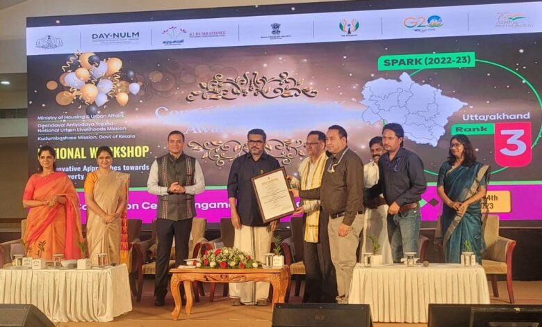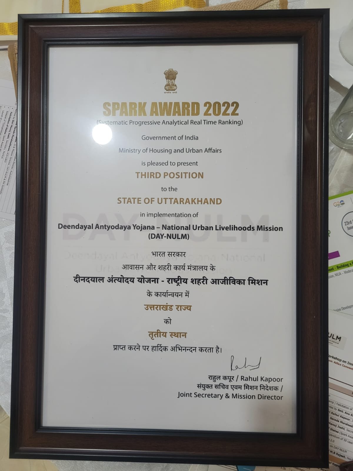 अपर निदेशक शहरी विकास अशोक पांडेय जी ने बताया कि शहरी विकास एवं आवास मंत्री जी एवं अपर मुख्य सचिव एवं प्रमुख सचिव शहरी विकास विभाग तथा निदेशक शहरी विकास निदेशालय के कुशल मार्गदर्शन में योजनान्तर्गत उत्कृष्ट प्रदर्शन किये जाने के फलस्वरूप आवासन एवं शहरी कार्य मंत्रालय भारत सरकार द्वारा राज्यों की स्पार्क (Systematic Progressive Analytical Real Time Ranking) रैकिंग में उत्तराखण्ड राज्य को (डे० एन०यू०एल०एम०) के अंतर्गत वित्तीय वर्ष 2021-22 में पूर्वोत्तर एवं हिमालयी राज्यों की श्रेणी में तृतीय स्थान प्राप्त करने पर प्रशस्ती प्रपत्र से सम्मानित एवं रू0 2.00 करोड़ की धनराशि से पुरूस्कृत किया गया।