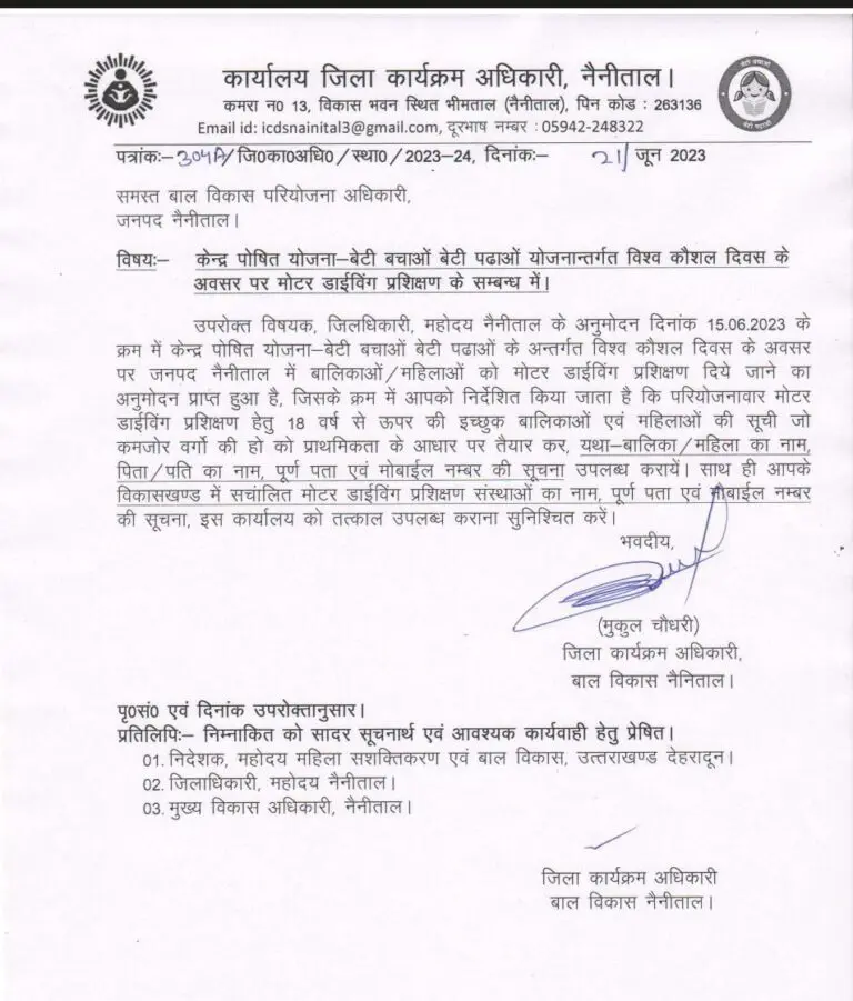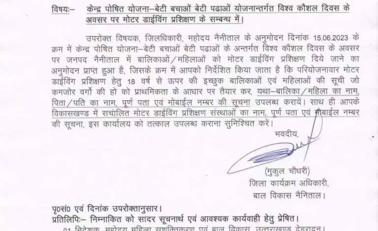 इस संबंध में सभी बाल विकास परियोजना अधिकारियों को पत्र लिखकर निर्देशित किए गए हैं कि जिलाधिकारी के निर्देश पर नैनीताल जिले में बालिकाओं महिलाओं को मोटर ड्राइविंग प्रशिक्षण दिए जाने को लेकर 18 वर्ष से ऊपर की इच्छुक बालिकाओं एवं महिलाओं की सूची जो कि कमजोर वर्गों की हो को प्राथमिकता के आधार पर तैयार करने के निर्देश दिए गए हैं।