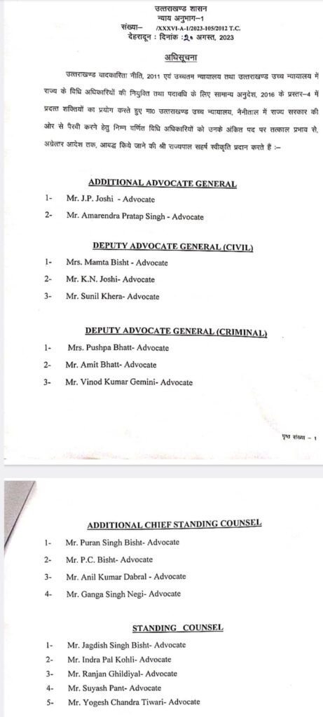 स्थायी अधिवक्ता जगदीश सिंह बिष्ट, इन्द्र पाल कोहली, राजन घिल्डियाल, सुयश पंत, योगेश चंद्र तिवारी