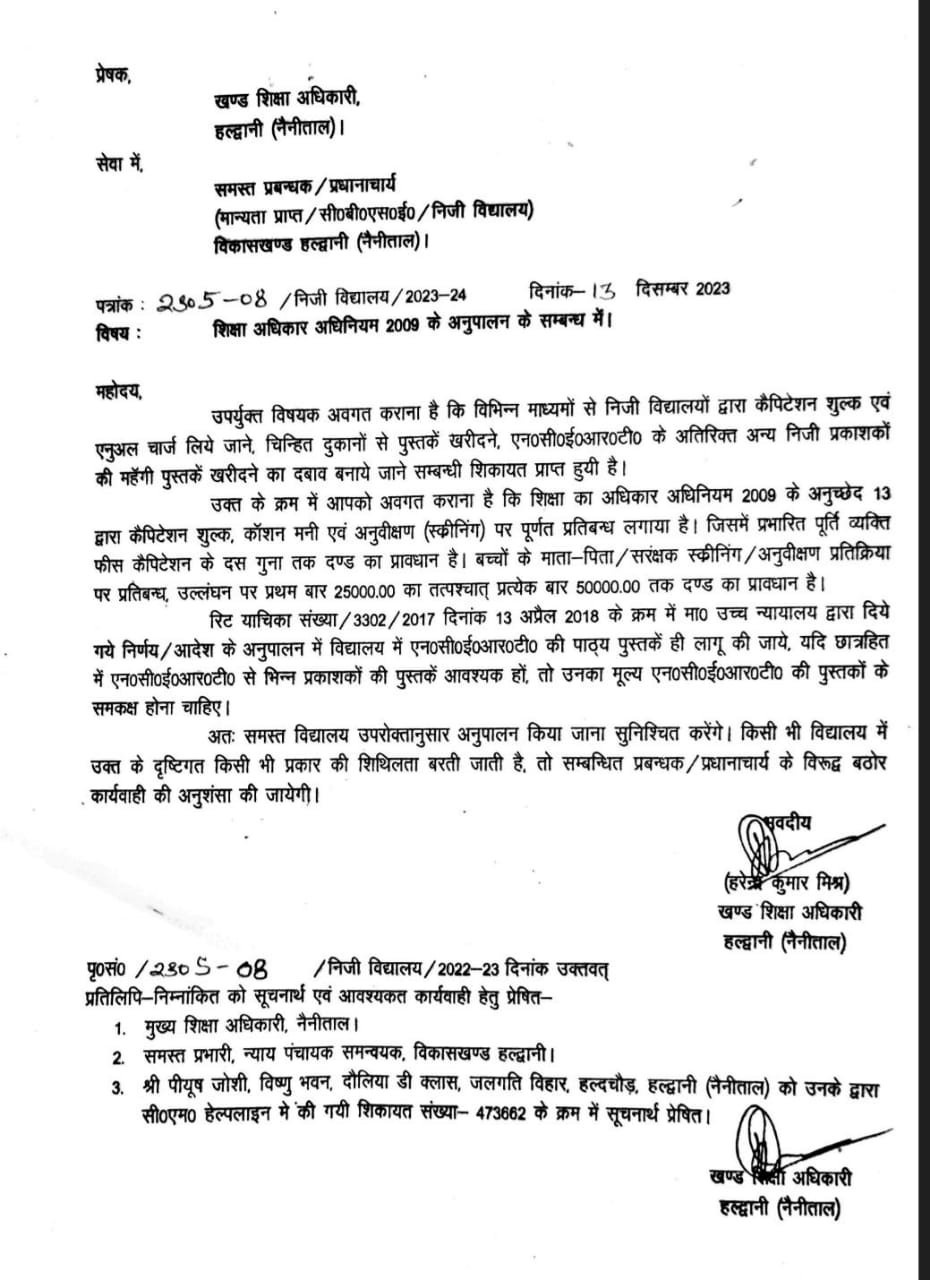 लालकुआं से संवाददाता गौरव गुप्ता : नैनीताल जीले मे काफी लम्बे समय से निजी विद्यालयों द्वारा कैपिटेशन शुल्क एवं एनुअल चार्ज लिये जाने, चिन्हित दुकानों से पुस्तकें खरीदने, एन०सी०ई०आर०टी० के अतिरिक्त अन्य निजी प्रकाशकों की महेंगी पुस्तकें खरीदने का दबाव बनाये जाने सम्बन्धी शिकायत प्राप्त होने पर शिक्षा विभाग ने बड़ी कार्यवाही कि है। हल्दुचौड़ निवासी समाजसेवी पीयूष जोशी कि शिकायत पर शिक्षा विभाग ने सभी विद्यालयों के प्रधानाचार्य को नोटिस जारी करते हुए आगाह किया है कि शिक्षा का अधिकार अधिनियम 2009 के अनुच्छेद 13 द्वारा कैपिटेशन शुल्क, कॉशन मनी एवं अनुवीक्षण (स्कीनिंग) पर पूर्णत प्रतिबन्ध लगाया है।