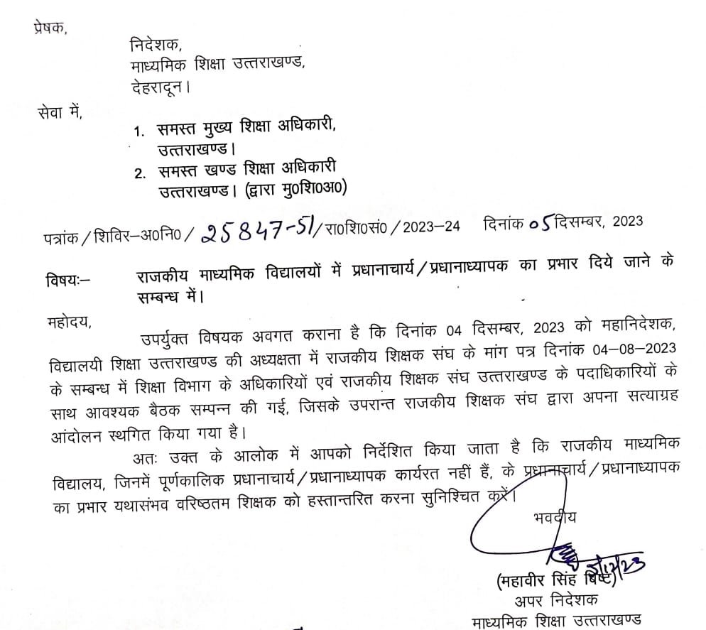 समस्त मुख्य शिक्षा अधिकारियों को जारी आदेश में निदेशक महावीर सिंह की ओर से कहा गया है कि कल 04 दिसम्बर, महानिदेशक, विद्यालयी शिक्षा की अध्यक्षता में शिक्षा विभाग के अधिकारियों और राजकीय शिक्षक संघ के प्रदेश पदाधिकारियों की बैठक के बाद राजकीय शिक्षक संघ ने अपना सत्याग्रह आंदोलन स्थगित कर दिया है। अतः जिन राजकीय माध्यमिक विद्यालयों में पूर्णकालिक प्रधानाचार्य/प्रधानाध्यापक कार्यरत नहीं हैं, के प्रधानाचार्य/प्रधानाध्यापक का प्रभार वरिष्ठतम शिक्षक को हस्तान्तरित करना सुनिश्चित करें।