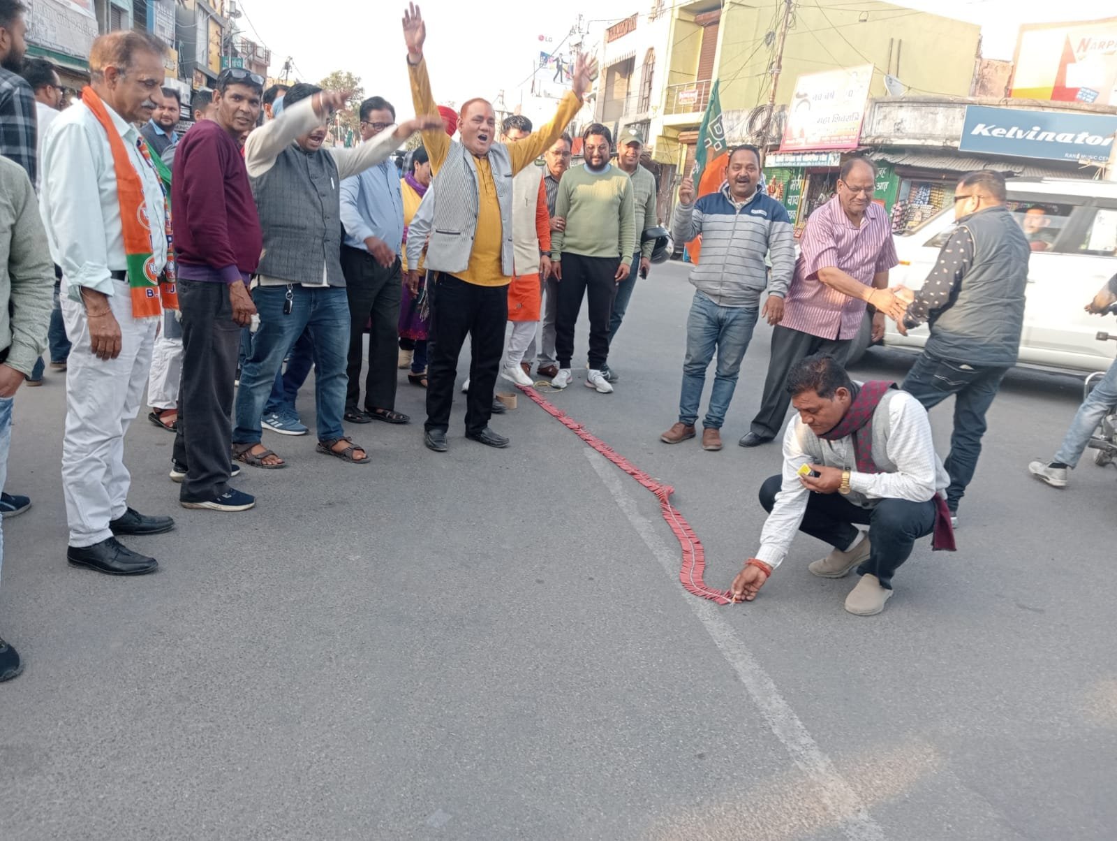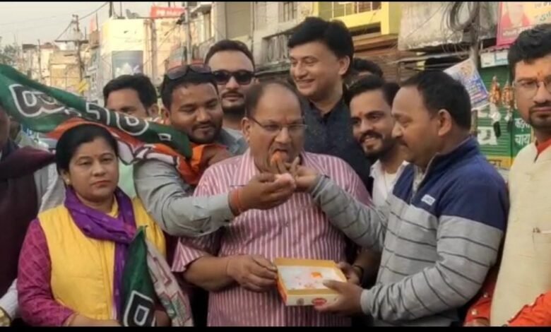 Party workers of Doiwala celebrate BJP’s victory in assembly elections held in North Eastern states