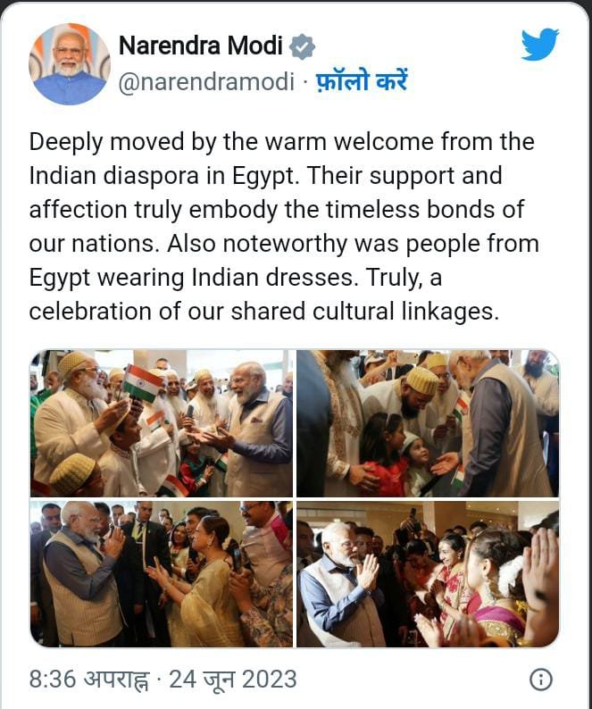 पीएम मोदी ने ट्वीट किया- ”मिस्र में भारतीय प्रवासियों के गर्मजोशी भरे स्वागत से मैं बहुत प्रभावित हुआ. उनका समर्थन और स्नेह वास्तव में हमारे राष्ट्रों के शाश्वत बंधन का प्रतीक है. यह भी उल्लेखनीय है कि मिस्र के लोग भारतीय पोशाक पहने थे. सचमुच यह हमारे साझा सांस्कृतिक संबंधों का उत्सव है.”