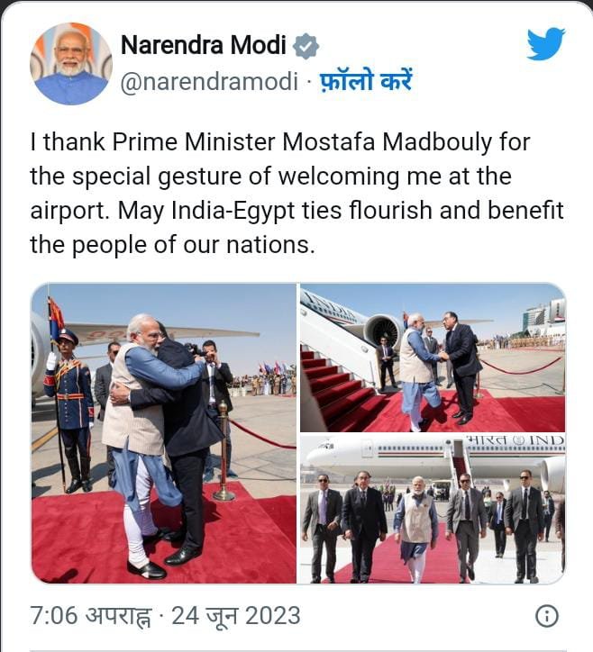 पीएम मोदी ने ट्वीट किया- ”मैं हवाई अड्डे पर विशेष भाव के साथ स्वागत करने के लिए प्रधानमंत्री मुस्तफा मैडबौली को धन्यवाद देता हूं. भारत-मिस्र संबंध फलें-फूलें और हमारे देशों के लोगों को लाभान्वित करें.”
