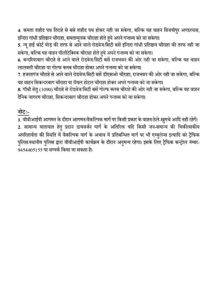 आज से राष्ट्रपति द्रोपदी मुर्मू का लखनऊ दौरा, रूट डायवर्जन देखकर ही घर से निकलें लखनऊ: राजधानी में राष्ट्रपति द्रोपदी मुर्मू के सोमवार और मंगलवार के कार्यक्रम के मद्देनजर सुरक्षा के कड़े बंदोबस्त किए गए हैं. कार्यक्रम स्थल इंदिरा गांधी प्रतिष्ठान और डिवाइन हार्ट एंड मल्टीस्पेशियलिटी हॉस्पिटल के आस पास का एरिया नो-फ्लाइंग जोन घोषित किया गया है. दोनों स्थलों के आस पास कोई प्राइवेट ड्रोन नहीं उड़ा सकेगा. ऐसा करने वालों पर कार्रवाई की जाएगी. राष्ट्रपति सोमवार को लखनऊ आएंगी और उनका रात में यहीं प्रवास होगा. विभिन्न मार्गों से उनके आवागमन के दौरान कुछ देर लिए सामान्य वाहनों का संचालन रोका जाएगा. राष्ट्रपति के आगमन को देखते हुए ट्रैफिक व्यवस्था दुरुस्त कर ली गई है. इसे लेकर नया रूट चार्ट तैयार किया गया है. आज शाम 4:50 बजे लखनऊ पहुंचेगी राष्ट्रपति राष्ट्रपति दो दिवसीय दौरे पर सोमवार को नई दिल्ली से लखनऊ पहुंचेंगीं. दिल्ली से विशेष विमान सेवा से वह शाम 4:50 लखनऊ के चौधरी चरण सिंह एयरपोर्ट पर पहुंचेंगीं. इसके बाद राष्ट्रपति एयरपोर्ट से ही डिवाइन हार्ट फाउंडेशन के 27 स्थापना दिवस आयोजन कार्यक्रम में शामिल होने के लिए जाएंगी. इसके बाद वह शाम 7:00 बजे कार्यक्रम से सीधे राज भवन पहुंचेंगे. राज भवन में ही राष्ट्रपति का मिनी कार्यालय होगा वह 12 तारीख को इंदिरा गांधी प्रतिष्ठान में इंडियन इंस्टीट्यूट आफ इनफॉरमेशन टेक्नोलॉजी (आईआईआईटी) लखनऊ के दूसरे दीक्षांत समारोह में बतौर मुख्य अतिथि शामिल होंगी. रूट डायवर्जन पर एक नजर रोडवेज और सिटी बसों के लिए यह मार्ग शहीद पथ मोड़ कानपुर रोड से रोडवेज और सिटी बसें शहीद पथ होते हुए रमाबाई अम्बेडकर मैदान, अहिमामऊ शहीद पथ की ओर नहीं जा सकेंगी, बल्कि यह बाराबिरवा चौराहा होकर अपने गन्तव्य को जा सकेगी. उतरेठिया शहीद पथ पुल चौराहे से रोडवेज और सिटी बसें उतरेठिया चौराहा से शहीद पथ पर नहीं जा सकेंगीे, बल्कि यह पीजीआई तिराहा अथवा तेलीबाग पुल चौराहा होकर अपने गन्तव्य को जा सकेंगी. सुल्तानपुर रोड की ओर से आने वाली रोडवेज और सिटी बसें अहिमामऊ चौराहा से शहीद पथ पर नहीं जा सकेंगी, बल्कि यह कैंट होकर अपने गन्तव्य को जा सकेंगी. कमता शहीद पथ तिराहे से बसें शहीद पथ होकर नहीं जा सकेंगी, बल्कि यह विजयीपुर अण्डरपास, इन्दिरा गांधी प्रतिष्ठान चौराहा, समतामूलक चौराहा होते हुए अपने गन्तव्य को जा सकेंगी. न्यू हाईकोर्ट मोड़ की तरफ से आने वाली रोडवेज और सिटी बसें इन्दिरा गांधी प्रतिष्ठान चौराहा की तरफ नहीं जा सकेंगी, बल्कि यह पॉलिटेक्निक चौराहा होते हुए अपने गन्तव्य को जा सकेंगी. बन्दरियाबाग चौराहे से आने वाली रोडवेज और सिटी बसें राजभवन की ओर नहीं जा सकेंगी, बल्कि यह लालबत्ती चौ