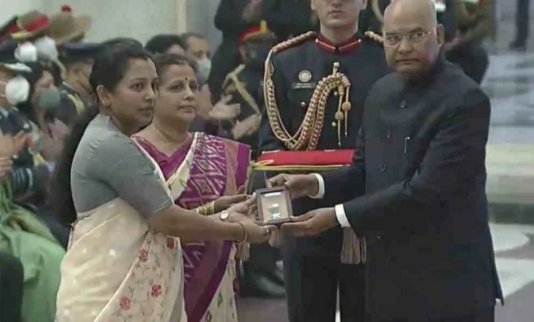 राष्ट्रपति रामनाथ कोविंद ने लद्दाख के गलवान घाटी में सैनिकों की झड़प में शहीद हुए कर्नल संतोष बाबू की मां और पत्नी को महावीर चक्र मरणोपरांत के वीरता पुरस्कार से मंगलवार को किया गया सम्मानित।