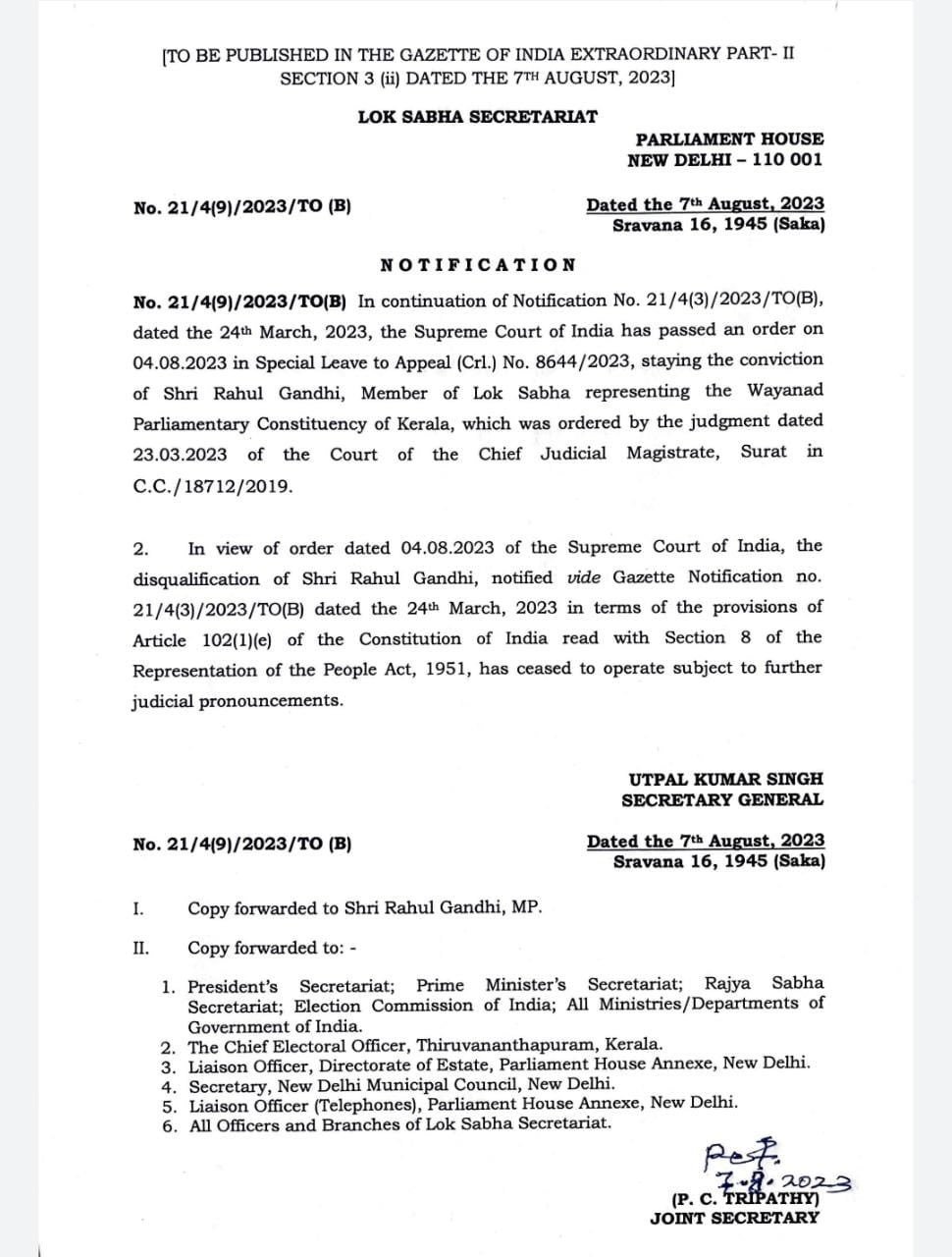 संसद में राहुल गांधी की वापसी, लोकसभा सचिवालय ने जारी की बहाली की अधिसूचना