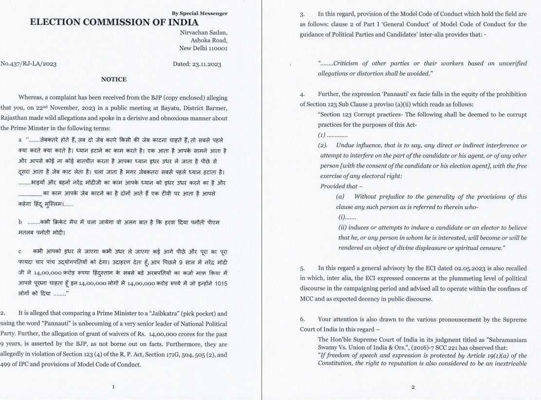 नई दिल्ली : चुनाव आयोग ने कांग्रेस सांसद राहुल गांधी को पीएम मोदी पर उनके ‘पनौती’ और ‘जेबकतरे’ तंज पर नोटिस जारी किया और उनसे 25 नवंबर तक जवाब देने को कहा है। पीएम मोदी पर विवादित टिप्पणी को लेकर कांग्रेस नेता मुश्किल में घिर गए हैं। राहुल गांधी के बयान को लेकर चुनाव आयोग ने एक्शन लिया है। आयोग की तरफ से राहुल गांधी को नोटिस जारी किया गया है। कांग्रेस नेता से जवाब भी मांगा गया है। राहुल को जवाब देने के लिए 25 नवंबर तक का समय दिया गया है।