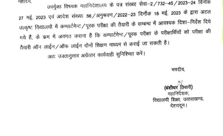 कि ग्रीष्मकालीन अवकाश में अटल उत्कृष्ट स्कूलों के शिक्षकों को अवकाश प्रदान किए जाएं । जिसको लेकर शिक्षा महानिदेशक बंशीधर तिवारी के द्वारा आदेश जारी किया गया है, कि कंपार्टमेंट को लेकर छात्रों की पढ़ाई अटल उत्कृष्ट स्कूलों में ग्रीष्मकालीन अवकाश में जो दिन शेष रह गए है।