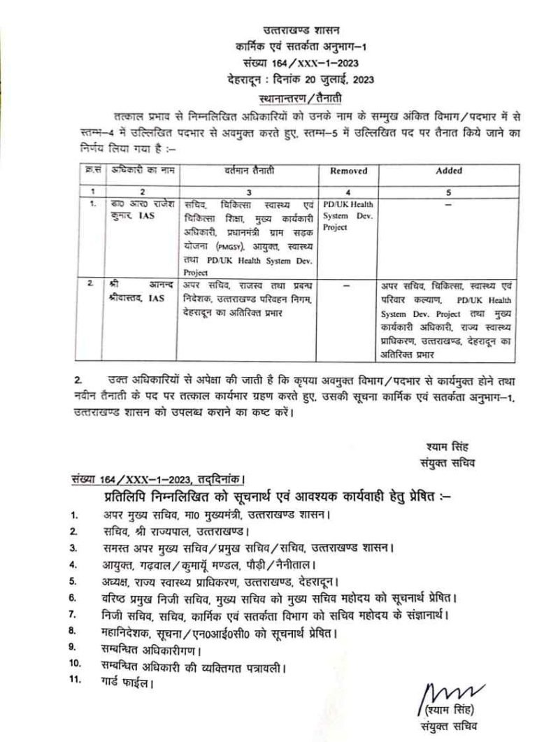 शासन ने एक बार फिर आईएएस अधिकारी के दायित्व में परिवर्तन किया है। आईएएस आनंद श्रीवास्तव को स्वास्थ्य प्राधिकरण के सीईओ स्वास्थ्य प्राधिकरण, अपर सचिव स्वास्थ्य चिकित्सा एवं परिवार कल्याण व प्रोजेक्ट डायरेक्टर की जिम्मेदारी दी गई है।