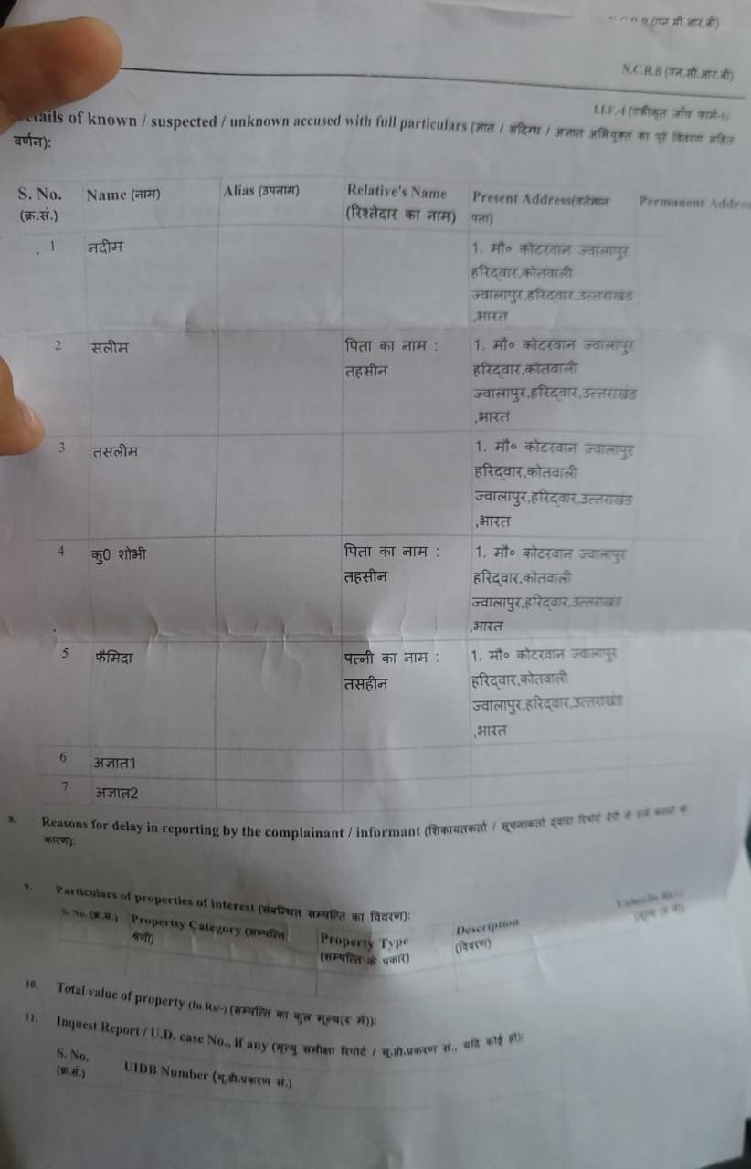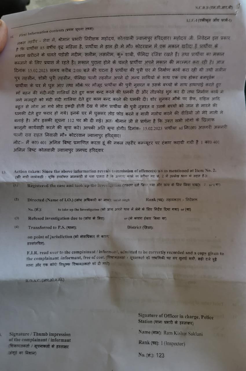 हरिद्वार। ज्वालापुर पुलिस ने 85 वर्षीय वृद्ध महिला की तहरीर पर कोटरवान निवासी परिवार के पांच सदस्यों सहित दो अज्ञात लोगों पर बलवा व मारपीट करने के आरोप में मुकदमा दर्ज कराया है। आरोपी लगातार प्रार्थीया की बेटी व उसके परिवार से रजिश रखते है। प्रार्थीया ने पुलिस को घर मे घुस तोड़फोड़ करने व गाली-गलोच करने की वीडियो भी दी है।