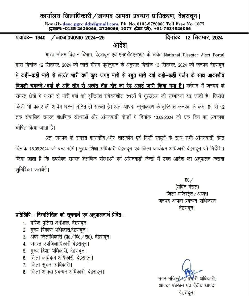 रिपोर्टर विनय उनियाल देहरादून: भारत मौसम विज्ञान विभाग, देहरादून एवं एन०डी०एम०ए० के सचेत National Disaster Alert Portal द्वारा 12 सितम्बर, 2024 को जारी मौसम पूर्वानुमान के अनुसार 13 सितम्बर, 2024 को जनपद देहरादून में कहीं-कहीं भारी से अत्यंत भारी वर्षा कुछ जगह भारी से बहुत भारी वर्षा कहीं-कहीं गर्जन के साथ आकाशीय बिजली चमकने/वर्षा के अति तीव्र से अत्यंत तीव्र दौर का रेड अलर्ट जारी किया गया है। वर्तमान में जनपद के समस्त क्षेत्रों में मध्यम से भारी वर्षा को दृष्टिगत सवेदनशील स्थलों में भूस्खलन की सम्भावना बढ़ जाती है। जिससे किसी भी प्रकार की अप्रिय घटना घटित हो सकती है। अतः आपदा न्यूनीकरण के दृष्टिगत जनपद के कक्षा 01 से 12 तक संचालित समस्त शैक्षणिक संस्थाओं और आंगनबाडी केन्द्रों में 13.09.2024 को एक दिन का अवकाश घोषित किया जाता है।