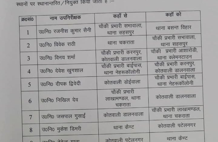 देहरादून: एसएसपी ने तबादले, कई चौकी प्रभारियों को किया Transfer देहरादून में एक बार फिर से एसएसपी ने तबादले किए हैं। एसएसपी ने कई चौकी प्रभारियों को इधर से उधर किया।