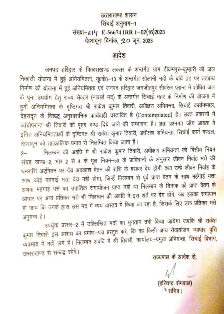 उक्त प्रकरणों में जांचोपरान्त तिवारी को बृहद दण्ड दिये जाने की सम्भावना है। अतः प्रश्नगत जाँच आख्या में इंगित अनियमितताओं के दृष्टिगत राकेश कुमार तिवारी, अधीक्षण अभियन्ता, सिचाई कार्य मण्डल, देहरादून को तात्कालिक प्रभाव से निलम्बित किया जाता है।