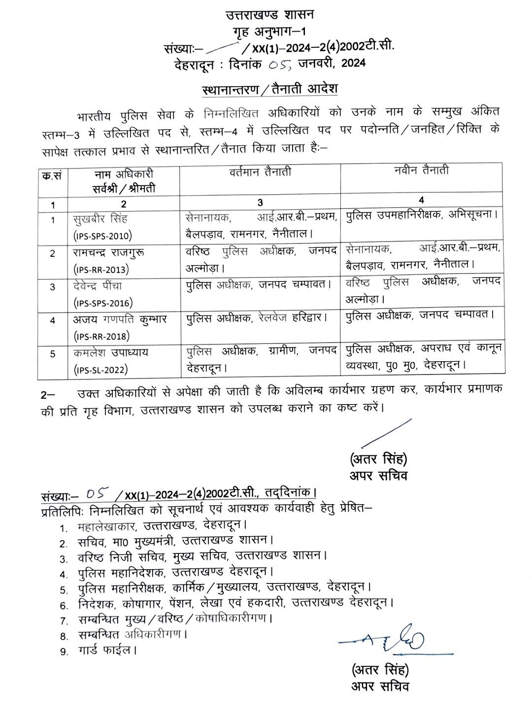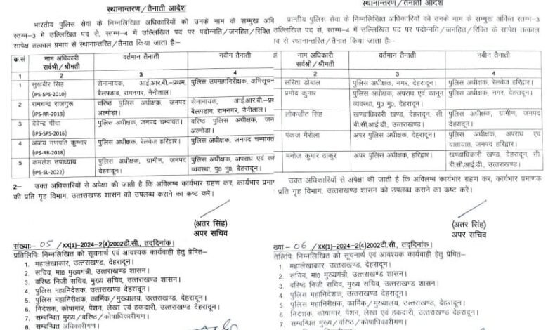 उत्तराखंड पुलिस विभाग में 5 आईपीएस और 5 पीपीएस पुलिस अधिकारियों के शासन ने किए तबादले