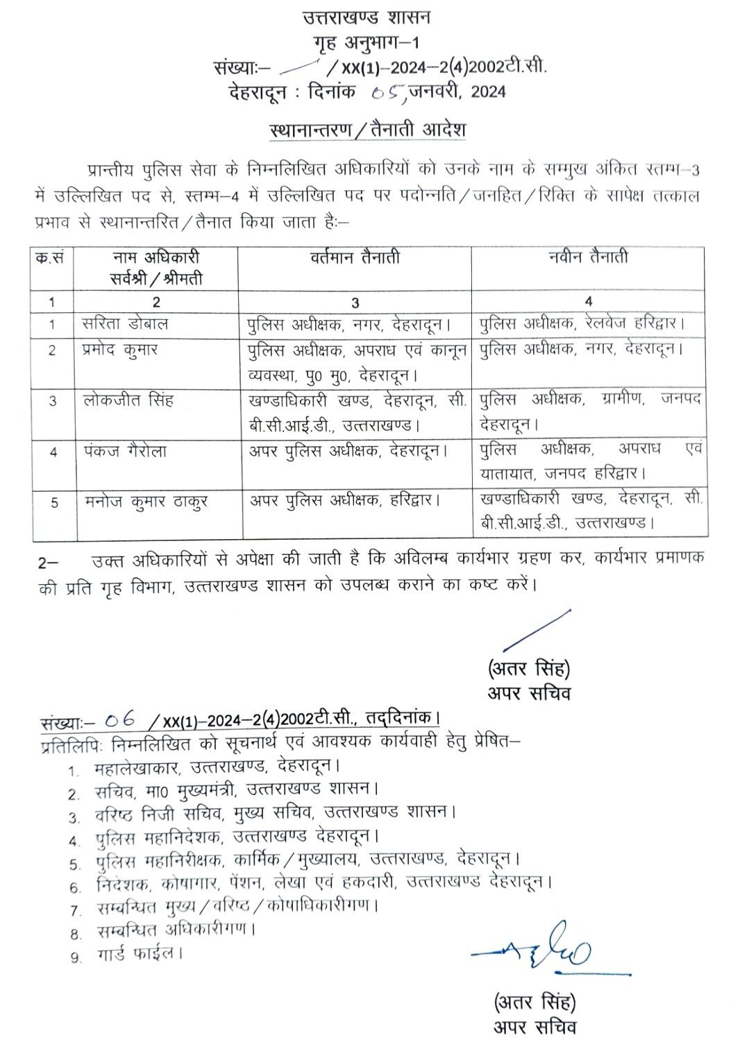 कमलेश उपाध्याय जो कि एसपी देहात देहरादून के पद पर तैनात थी, अब वह देहरादून में ही पुलिस अधीक्षक अपराध एवं कानून व्यवस्था बनाई गई है। इनकी तैनाती पुलिस मुख्यालय पर होगी। राजधानी की एसपी सिटी रही सरिता डोबाल पुलिस अधीक्षक रेलवे हरिद्वार बनाई गई है।प्रमोद कुमार पुलिस अधीक्षक नगर देहरादून बनाए गए हैं। लोक जीत सिंह सीबीसीआईडी से पुलिस अधीक्षक ग्रामीण देहरादून के पद पर तैनाती पाने में सफल रहे। इसके अलावा पंकज गैरोला को एसपी क्राइम हरिद्वार की कमान मिली। वहीं मनोज ठाकुर एएसपी हरिद्वार के पद से खंड अधिकारी सीआईडी देहरादून के पद पर लाए गए है।